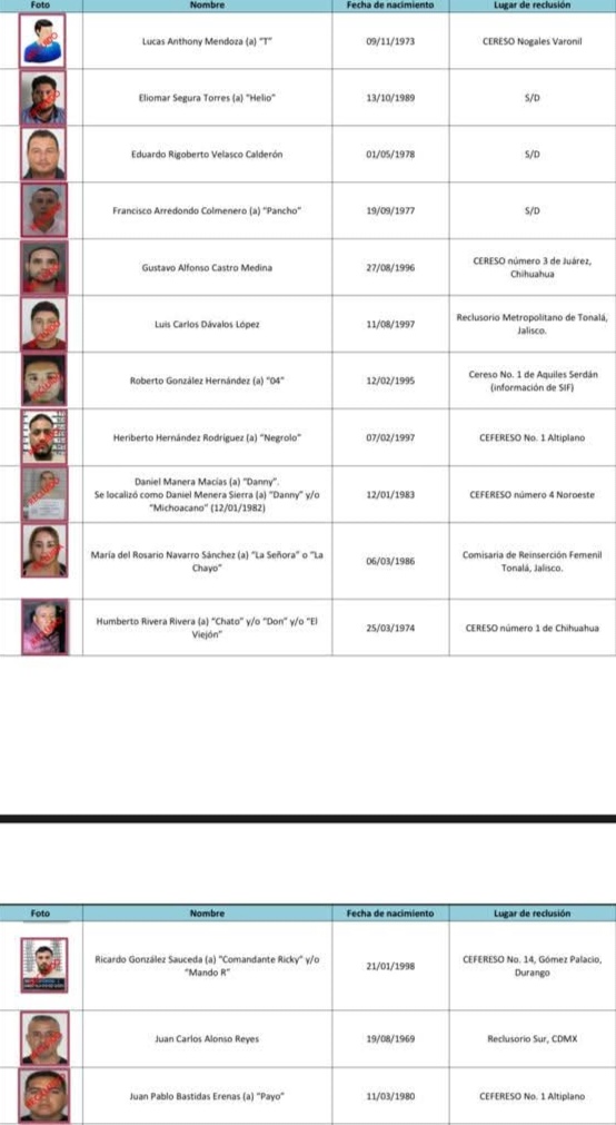 Otros fugitivos trasladados incluyen a Fidel Félix Ochoa, Oscar Hernández Flores, Luis Alonso Navarro Quezada, David Eliezer Seas Centeno, Carlos Alberto Guerrero Mercado, Jair Francisco Patrón Tobías, Guillermo Isaias Pérez Parra, Manuel Ignacio Correa, Yahir Alejandro Luján Rojo, Lucas Anthony Mendoza, Francisco Arredondo Colmenero, Gustavo Castro Medina, Luis Carlos Dávalos López, Daniel Manera Macías, Humberto Rivera Rivera y Ricardo González Sauceda.