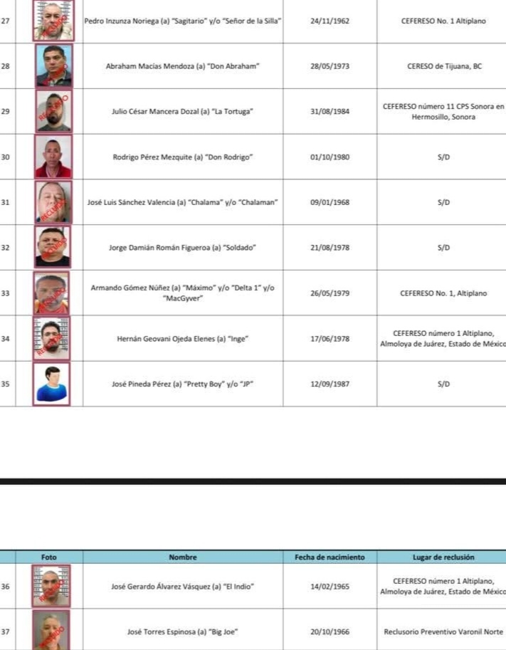 Otros fugitivos trasladados incluyen a Fidel Félix Ochoa, Oscar Hernández Flores, Luis Alonso Navarro Quezada, David Eliezer Seas Centeno, Carlos Alberto Guerrero Mercado, Jair Francisco Patrón Tobías, Guillermo Isaias Pérez Parra, Manuel Ignacio Correa, Yahir Alejandro Luján Rojo, Lucas Anthony Mendoza, Francisco Arredondo Colmenero, Gustavo Castro Medina, Luis Carlos Dávalos López, Daniel Manera Macías, Humberto Rivera Rivera y Ricardo González Sauceda.