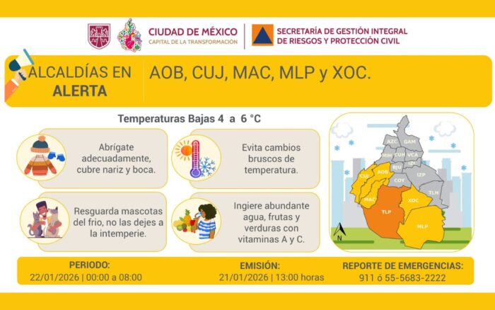 La Secretaría de Gestión Integral de Riesgos y Protección Civil de la Ciudad de México emitió una serie de avisos preventivos ante el pronóstico de bajas temperaturas que afectarán a diversas alcaldías durante las primeras horas del jueves 22 de enero.