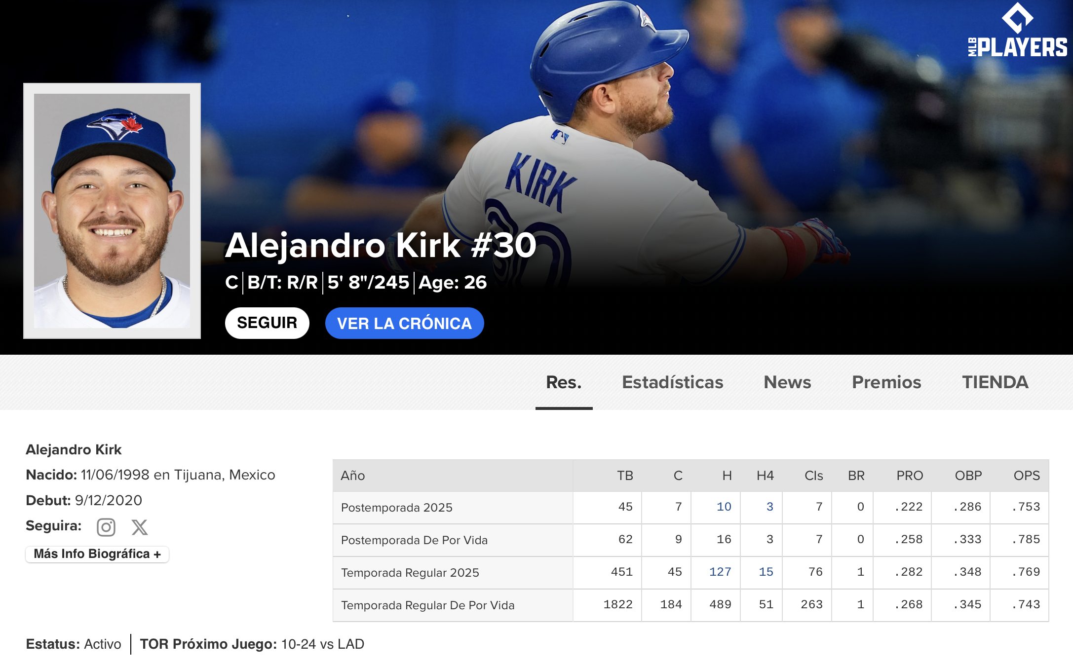 En la postemporada 2025 de Grandes Ligas, 'El Capitán Kirk' ha brillado para los Azulejos con 3 cuadrangulares clave, 10 hits y siete carreras anotadas.