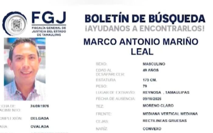 Este martes se cumplen 12 días de la desaparición de Marco Antonio Mariño Leal, vicepresidente de la Federación de la Cámara Nacional de Comercio (Fecanaco) en Tamaulipas, quien fue privado de su libertad a plena luz del día en la ciudad de Reynosa el pasado 9 de octubre.