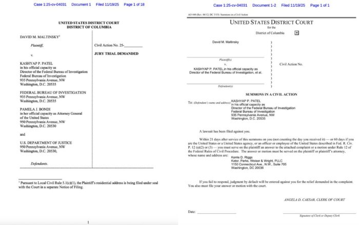 La demanda señala directamente a Kashyap P. Patel, en su capacidad oficial como Director del Buró al FBI; a Pamela J. Bondi, en su capacidad oficial como Fiscal General de los Estados Unidos; y al Departamento de Justicia (DOJ).