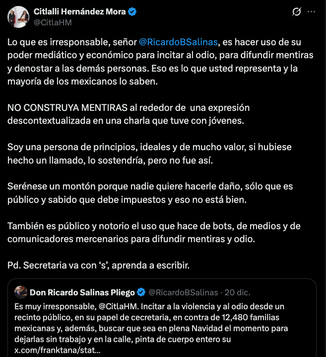 Citlalli Hernández respondió en X que Salinas Pliego está intentando construir una “mentira” alrededor de una “expresión descontextualizada”. Afirmó que no hizo un llamado al boicot y señaló el uso de bots para “difundir mentiras y odio”.