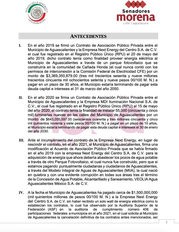 En febrero del año pasado, la senadora Nora Ruvalcaba Gámez, del Grupo Parlamentario de Morena, presentó una proposición con punto de acuerdo ante el Senado de la República para exhortar a la Fiscalía General de la República (FGR) a que informara al Senado sobre “el avance y el estado general que guardan las Carpetas de Investigación sobre las denuncias relacionadas con el Convenio de Reestructura de la Asociación Público Privada entre el Municipio de Aguascalientes, y sus Organismos Descentralizados, denominado Programa de Eficiencia Energética con la Empresa Next Energy del Centro S.A. de C.V.”.