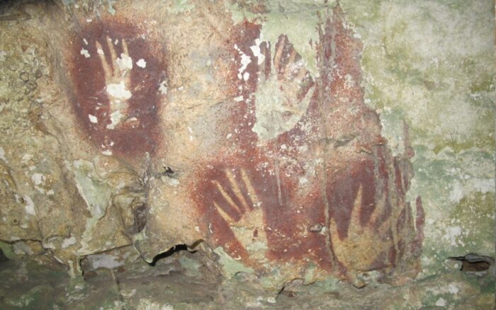 Se trata de la plantilla de una mano, rodeada de otras figuras pintadas más recientemente, y es 15 mil años más antigua que el anterior hallazgo arqueológico hallado en la misma cueva de Indonesia.