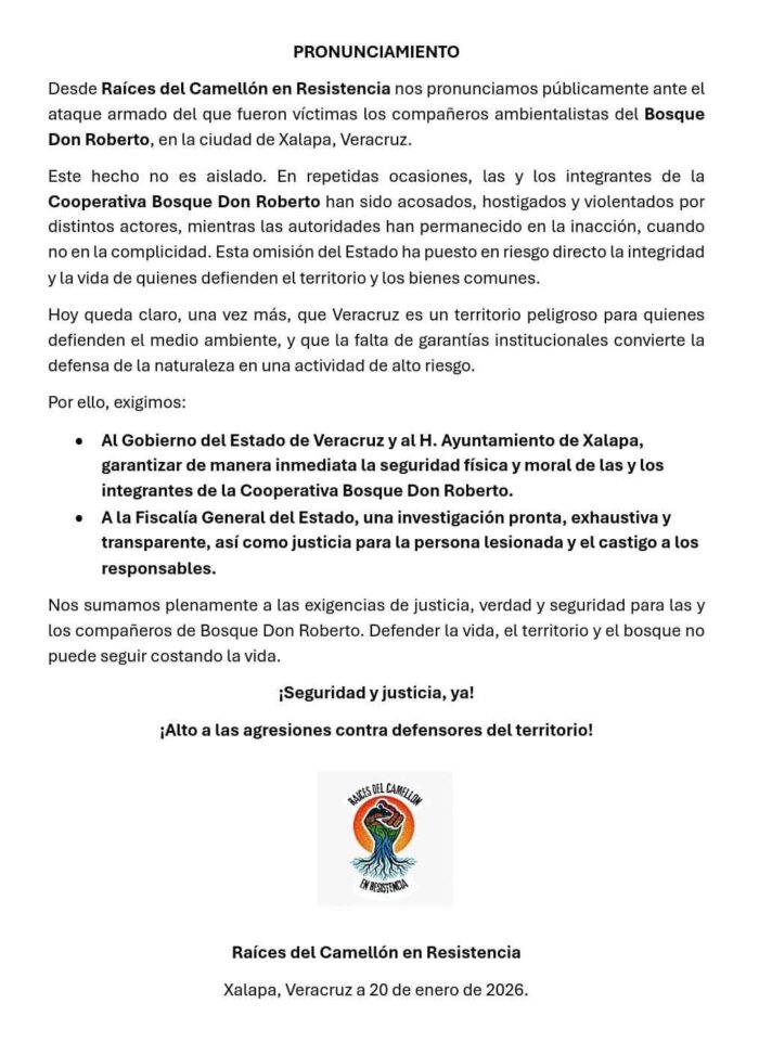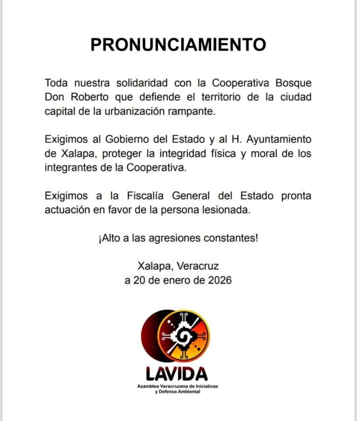 Diversas organizaciones ambientalistas expresaron su preocupación por la seguridad de los integrantes de la Cooperativa; LAVIDA aseguró que la defensa del Bosque Don Roberto, ubicado en la capital de Veracruz, ha sido constante frente a la urbanización y los intereses privados.