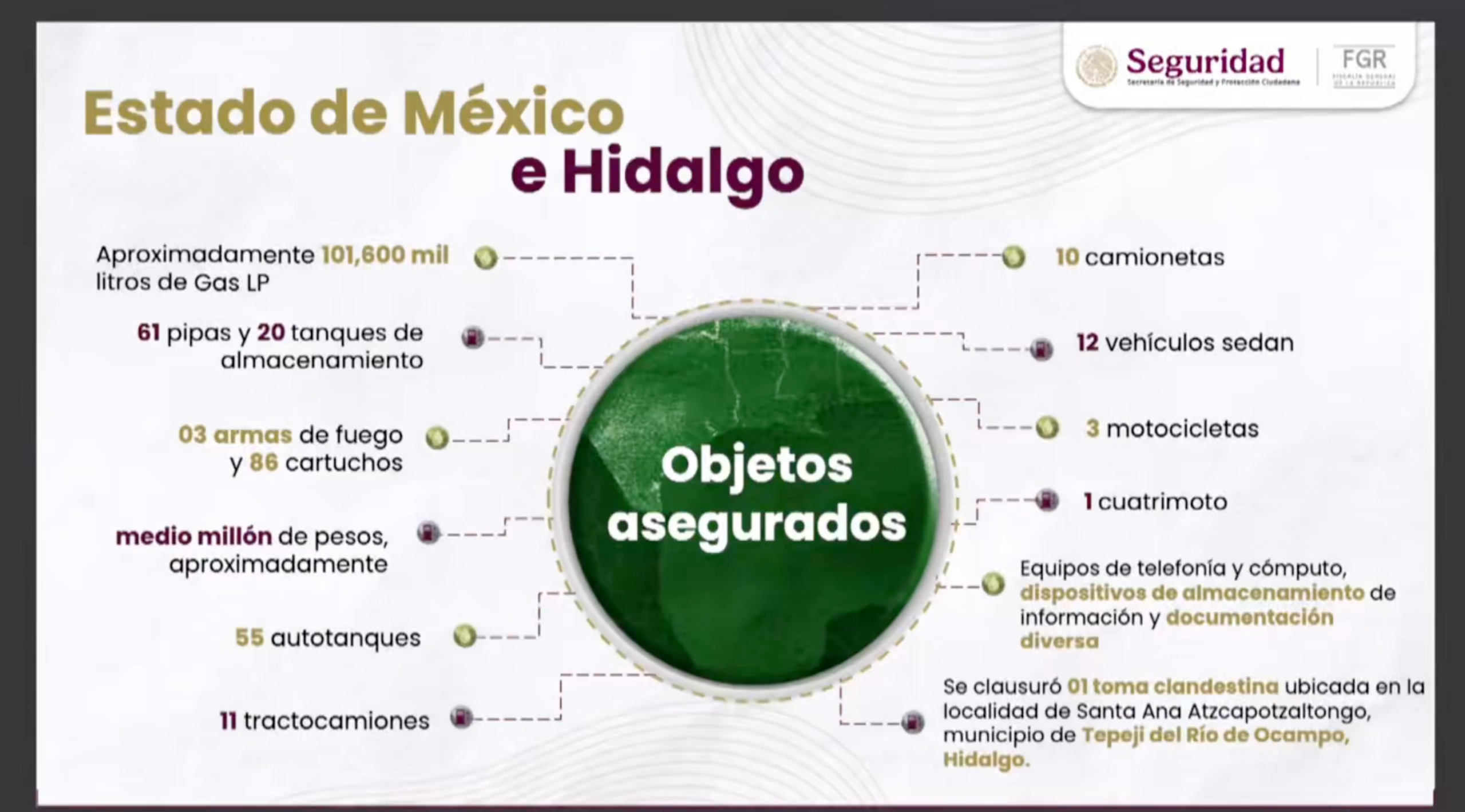Asimismo, fueron asegurados más de 150 mil litros de Gas LP, 61 pipas, 55 autotanques, 20 tanques de almacenamiento, 11 tractocamiones, vehículos, armamento, droga, dinero en efectivo y equipo tecnológico.
