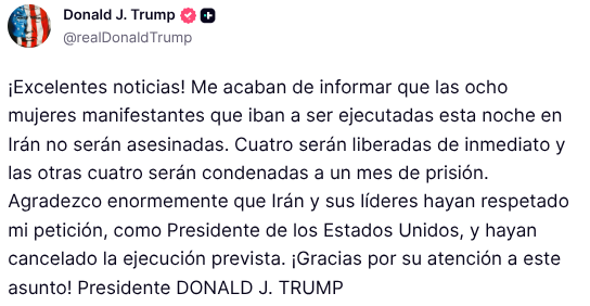"¡Excelentes noticias! Me acababan de informar que las ocho mujeres manifestantes que iban a ser ejecutadas esa noche en Irán no serían asesinadas", sostuvo Trump.