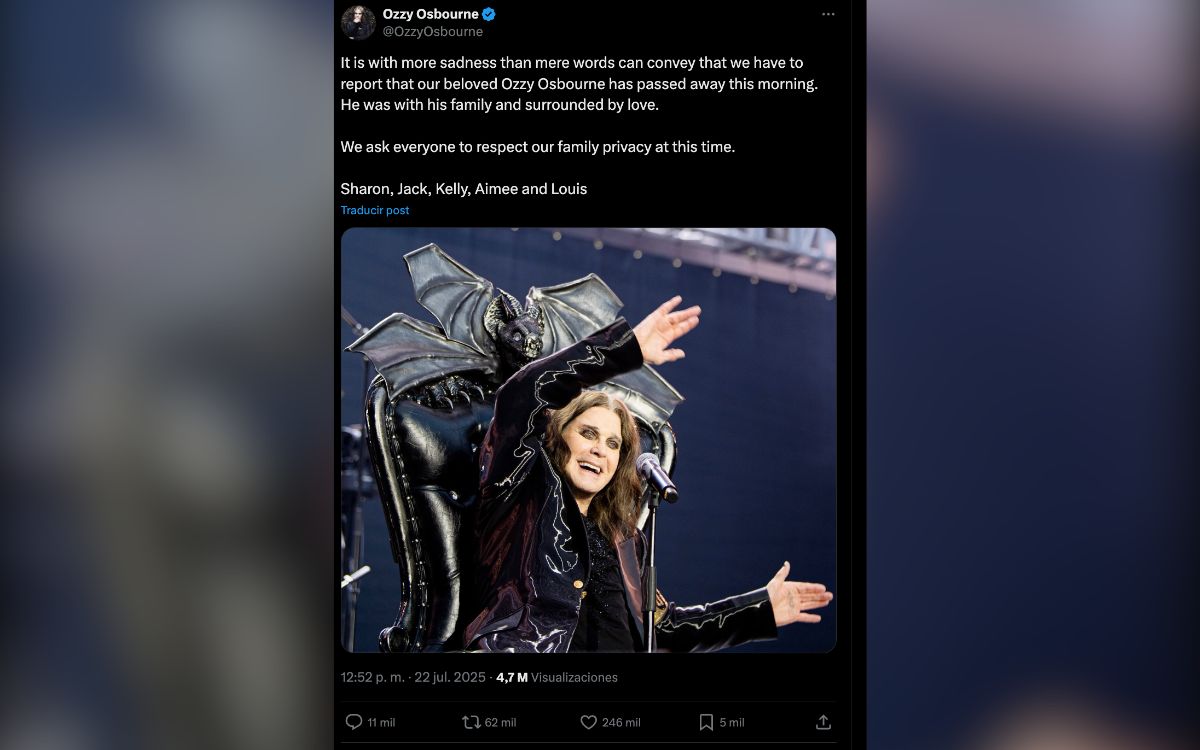 “Con una tristeza que las meras palabras no pueden expresar, tenemos que informar que nuestro amado Ozzy Osbourne falleció esta mañana. Estaba con su familia y rodeado de amor. Pedimos a todos que respeten la privacidad de nuestra familia en este momento”, dice un comunicado de la familia publicado en redes sociales.