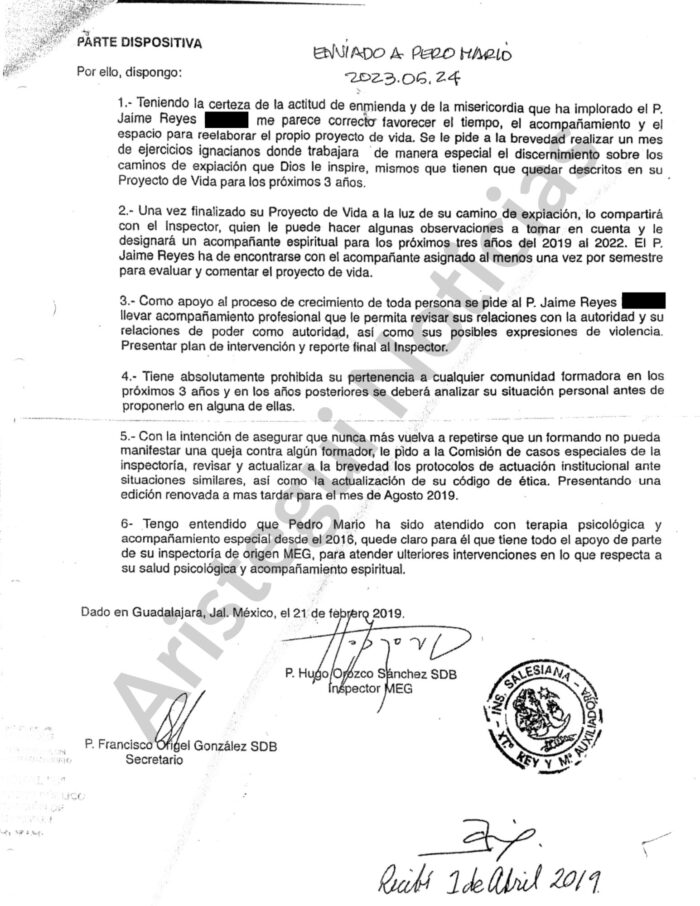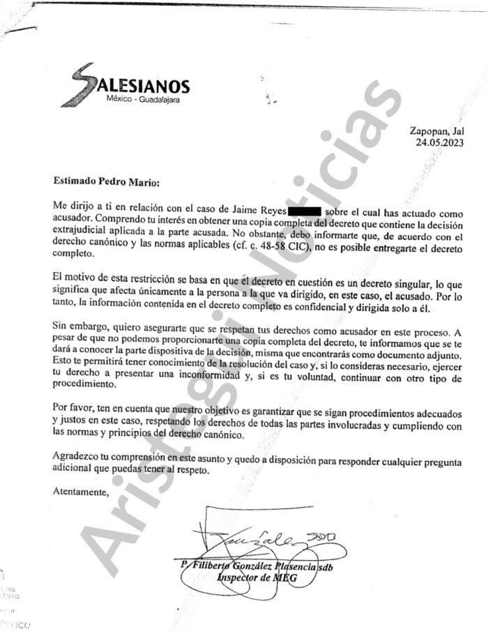 Pedro Mario señala que, incluso después de la resolución, la Congregación Salesiana continuó obstaculizando la transparencia de su caso. En 2023, el P. Filiberto González Plascencia, inspector de la MEG, le informó que, de acuerdo con el derecho canónico, no era posible entregarle una copia completa del decreto que sancionaba a Jaime Reyes, ya que el documento es un “decreto singular” y “confidencial y dirigida solo a él [al acusado]”.