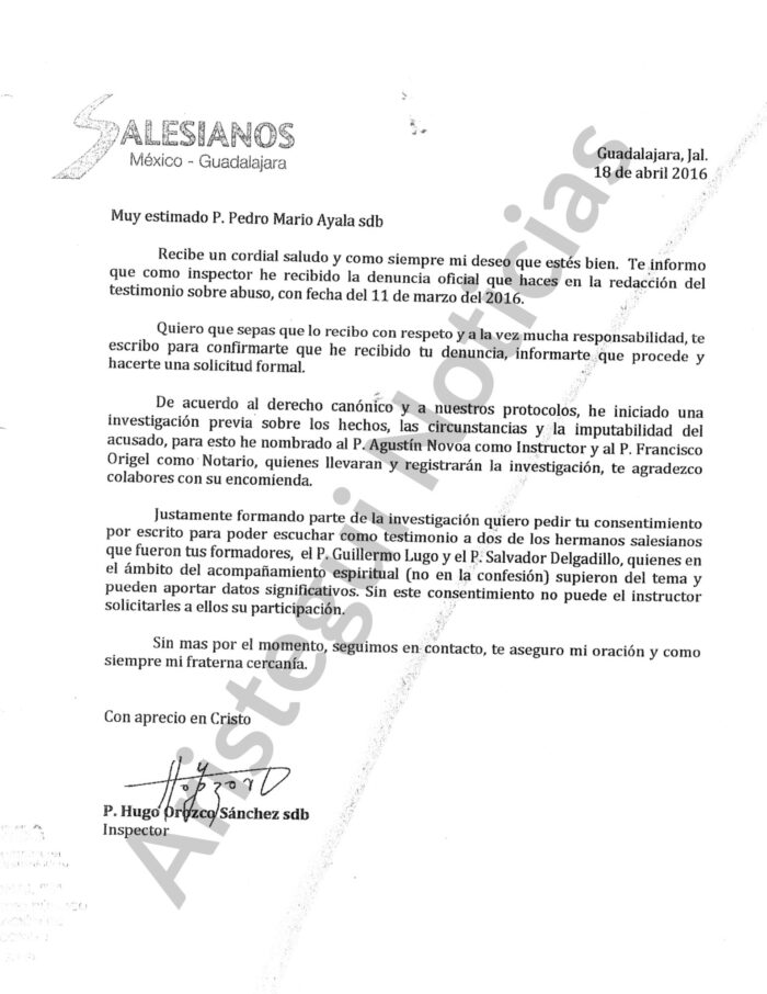 Fernández Artime, en cambio, solicitó una declaración firmada. Así, el denunciante formalizó por escrito su testimonio el 11 de marzo de 2016, iniciando así una investigación canónica interna. Las pesquisas fueron dirigidas por el padre Hugo Orozco Sánchez, en ese entonces inspector de la MEG, junto con el P. Agustín Novoa como instructor y el P. Francisco Origel como notario.