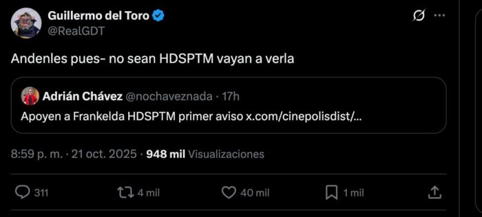 El cineasta Guillermo del Toro, quien esta semana también estrena su versión de ‘Frankenstein‘ en seleccionados cines del país, compartió a través de sus redes sociales un mensaje de apoyo a la producción de Frankelda: “Ándenles pues – no sean HDSPTM, vayan a verla.”