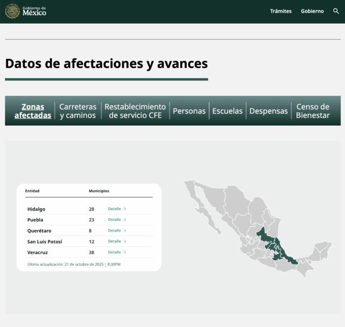 Durante su conferencia de prensa matutina, la mandataria mostró el micrositio oficial que acumula la estadística por estos fenómenos meteorológicos en la que se apunta que el estado más afectado es Veracruz con 35 muertos y 11 personas que todavía no se han localizado, seguido de Hidalgo, con 22 fallecidos y 8 desaparecidos; Puebla con 20 decesos y 4 personas desaparecidas, y Querétaro con un muerto.