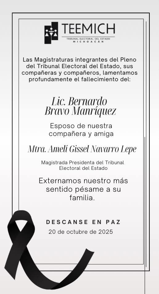 El TEEMICH y otros organismos electorales del país emitieron sus condolencias, deseándole fortaleza ante la pérdida irreparable.