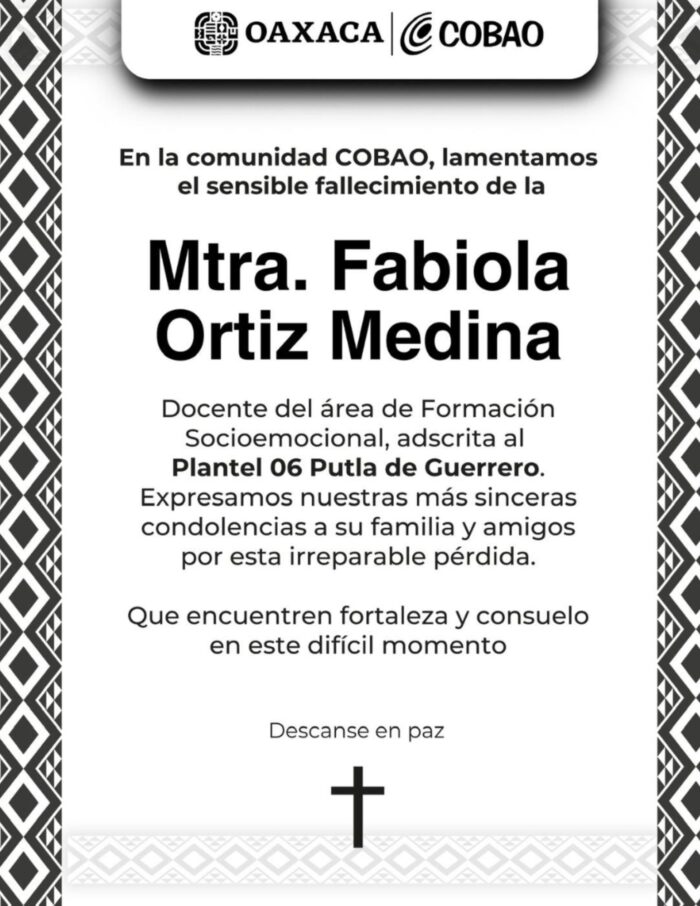 Fabiola Ortiz Medina, docente y psicóloga, fue asesinada por disparos de arma de fuego el pasado miércoles 15 de octubre en las inmediaciones del Colegio de Bachilleres del Estado de Oaxaca (Cobao), Plantel 06, en este municipio. El motivo del crimen sería, según informó la fiscalía del estado recientemente, el descontento de un estudiante con una mala calificación.