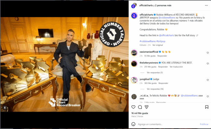 “Ni siquiera el confiado joven de 16 años de Stoke-on-Trent habría creído que esto fuera posible cuando se unió a Take That en 1990, ¡pero aquí está, en la cima del mundo, el artista con más álbumes número uno del Reino Unido de todos los tiempos!”, afirmó.