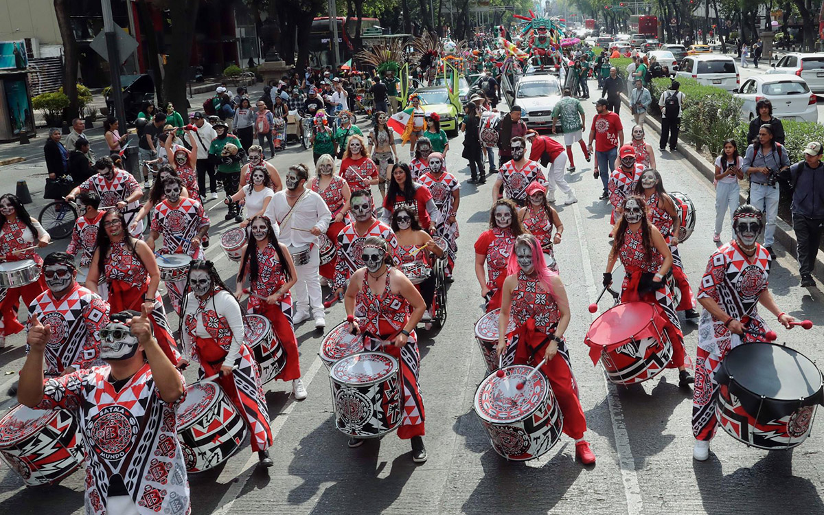 En un ambiente festivo, contingentes de catrinas y catrines avanzaron por Paseo de la Reforma con maquillajes y vestuarios que combinaban elementos tradicionales con referencias futboleras, como balones, banderas y camisetas de la selección mexicana.