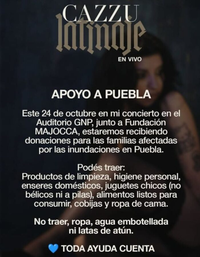 La cantante argentina Cazzu anunció que su concierto programado para el próximo 24 de octubre en el Auditorio GNP de Puebla tendrá una función adicional a la artística, ya que fungirá también como centro de acopio para recibir donaciones destinadas a las familias afectadas por las recientes e intensas inundaciones que azotaron al estado.