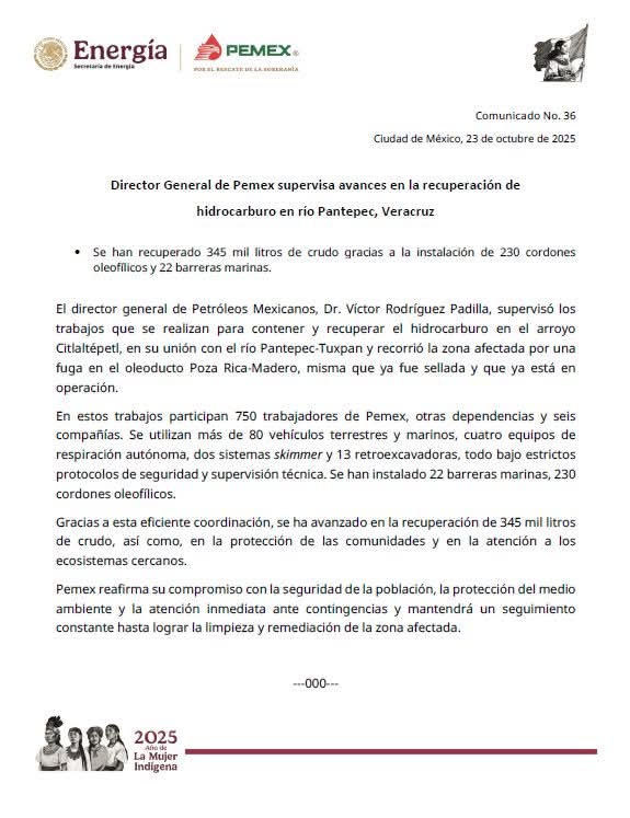 Petróleos Mexicanos (Pemex) informó que ha logrado recuperar 345 mil litros de crudo tras la fuga registrada en el oleoducto Poza Rica-Madero, en la zona del arroyo Citlaltépetl y su unión con el río Pantepec-Tuxpan.