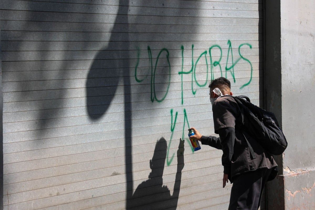 Durante su paso por calles del Centro Histórico y avenida Reforma realizaron algunas pintas en cortinas de negocios de la calle Madero y Juárez.