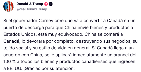 “China se tragará a Canadá, la devorará por completo, incluyendo la destrucción de sus empresas, su tejido social y su estilo de vida en general. Si Canadá firma un acuerdo con China, se le impondrá inmediatamente un arancel del 100% a todos los bienes y productos canadienses que entren a Estados Unidos”, añadió en su mensaje.
