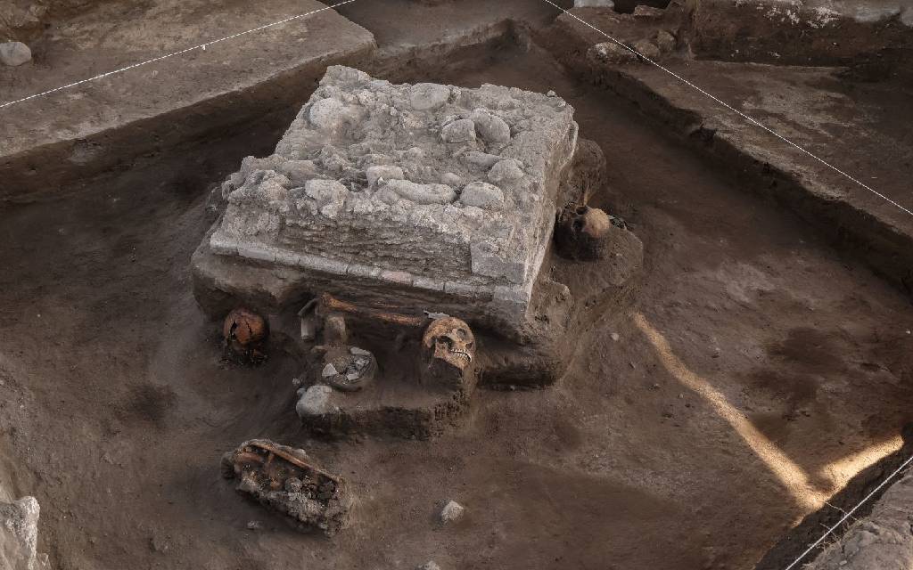 En el arranque del altar había dos cráneos, uno orientado hacia la parte superior y otro hacia el suroeste. Conforme descendieron los niveles, se detectó un apisonado con un estucado, posiblemente de cal con arena, y debajo de este se encontraron las otras dos osamentas incompletas, así como algunas vasijas.