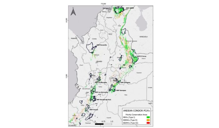 Áreas Prioritarias de Conservación (APC) para el Cóndor Andino en Colombia. Los colores representan áreas prioritarias a escala de paisaje. Verde: áreas de bajo riesgo con una alta probabilidad de selección de refugio (APC Tipo I). Amarillo: áreas con riesgos medios para la conservación y alta probabilidad de selección de refugio y áreas con superposición de presión antropogénica (APC Tipo II). Rojo: áreas de alto riesgo para la conservación del Cóndor Andino con alta probabilidad de selección de refugio y alta presión antropogénica (APC Tipo III). Foto: Mongabay Latam.