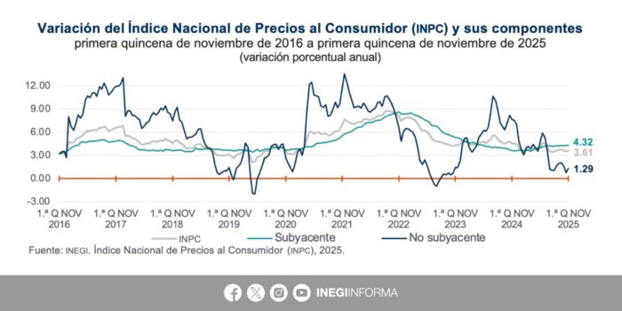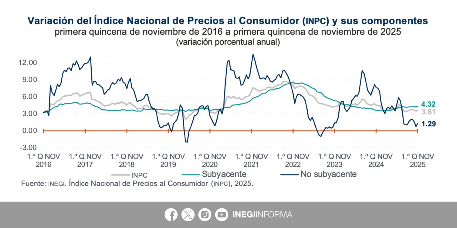 El Instituto Nacional de Estadística y Geografía (Inegi) informó que el Índice Nacional de Precios al Consumidor (INPC) registró un incremento de 0.47 % durante la primera quincena de noviembre de 2025, lo que ubicó la inflación general anual en 3.61 %.