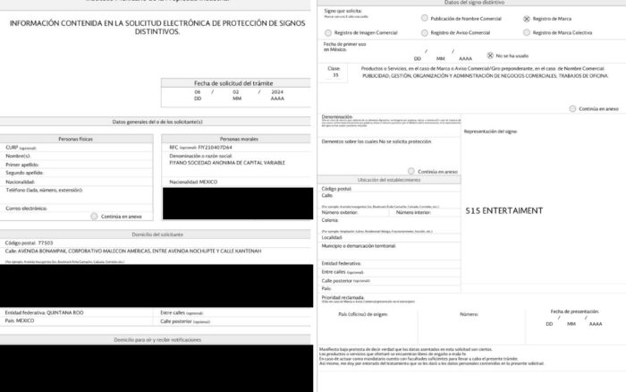 La marca 515 Entertainment fue registrada en febrero de 2024 por la razón social Fiyano S.A. de C.V., un holding que concentra distintas marcas, entre ellas FullPass y la mayor parte del Hell & Heaven.
