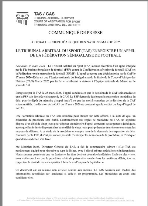 El Tribunal de Arbitraje Deportivo (TAS) confirmó este miércoles que ha registrado el recurso de la Federación de Futbol de Senegal contra la Confederación Africana (CAF) y la Federación Marroquí (FRMF), por la anulación de su victoria en la final de la última Copa de África.