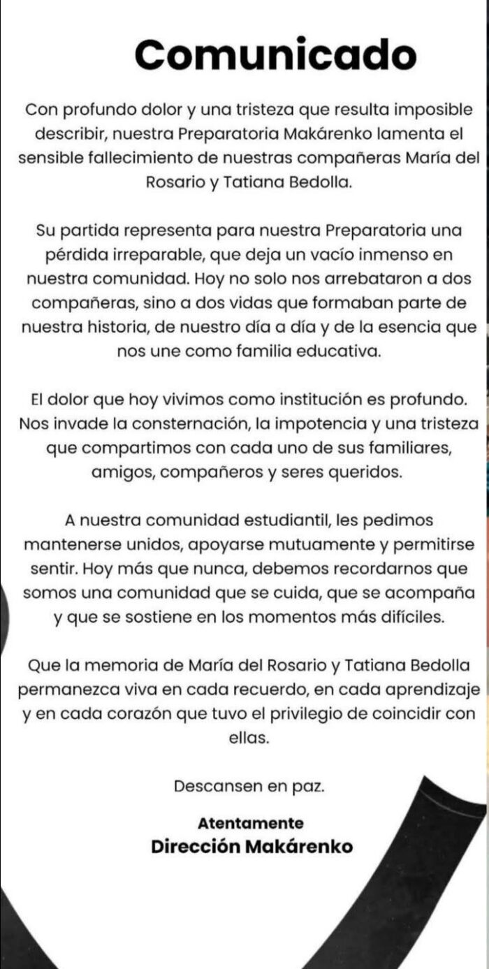 “Con profundo dolor y una tristeza que resulta imposible describir, nuestra Preparatoria Makárenko lamenta el sensible fallecimiento de nuestras compañeras María del Rosario y Tatiana Bedolla”, señaló el plantel.
