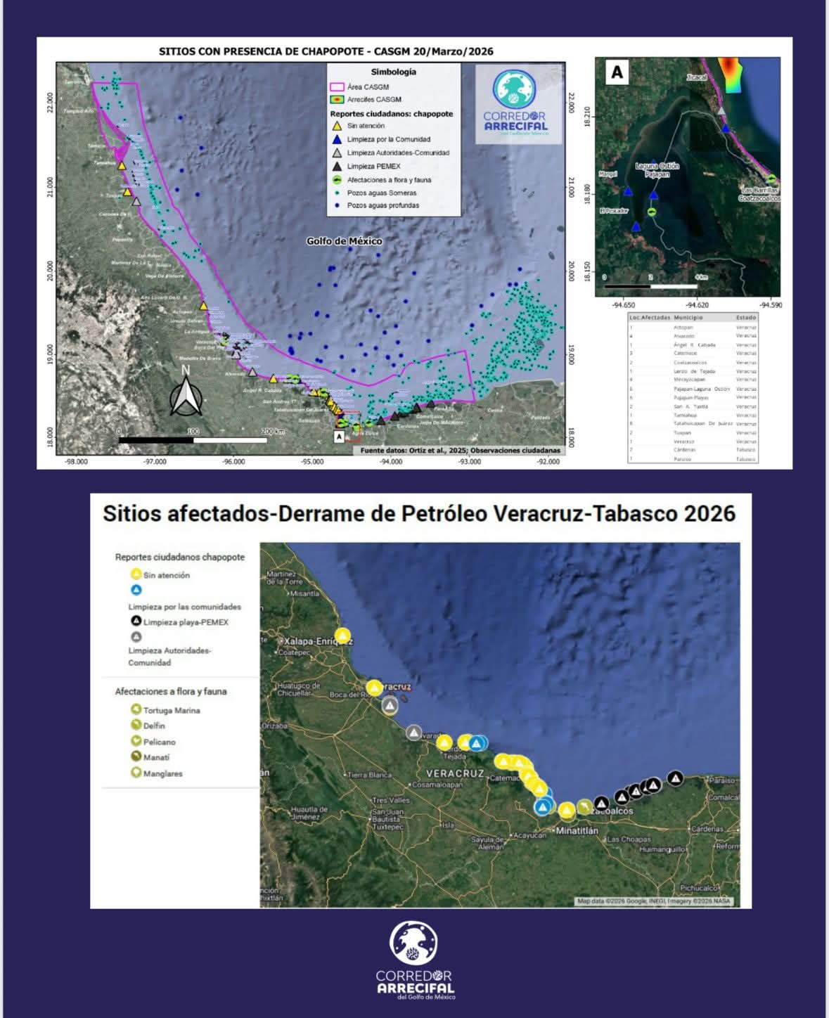 La organización Red Corredor Arrecifal del Golfo de México impulsó un mapeo ciudadano para documentar la presencia de hidrocarburos y daños a la fauna en playas, lagunas y zonas marinas de Veracruz y Tabasco, tras el derrame petrolero que se ha extendido a lo largo de cientos de kilómetros en el litoral del Golfo de México.