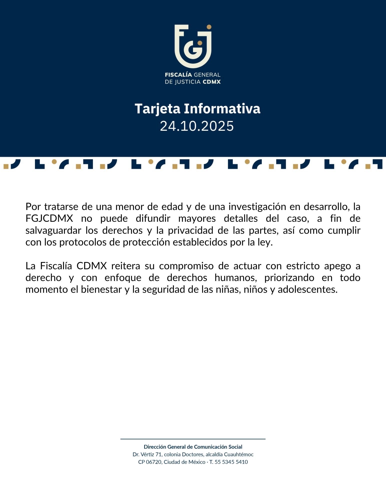 La Fiscalía apuntó en un comunicado que la menor “actualmente permanece bajo resguardo institucional, en condiciones seguras y con acompañamiento integral, conforme al principio del interés superior de la niñez, derivado de una investigación en curso por violencia familiar”.