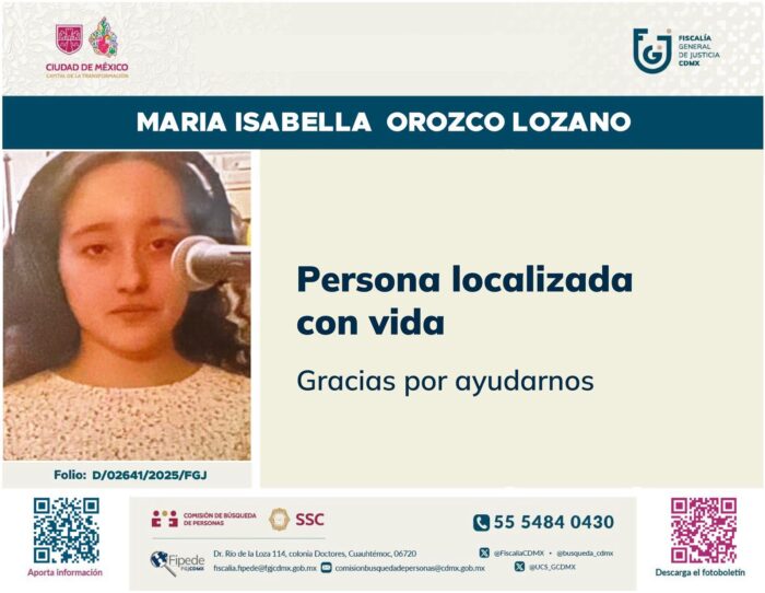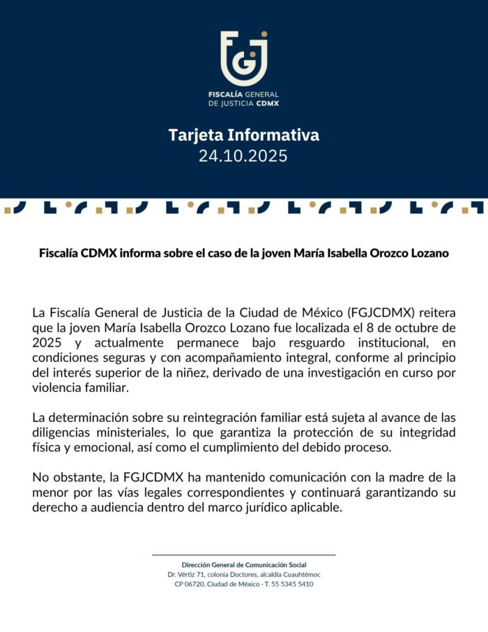 La Fiscalía de la Ciudad de México informó este viernes que mantiene bajo “resguardo institucional” a la joven María Isabella Orozco Lozano, de 16 años, quien fue localizada el 8 de octubre pasado tras más de un mes desaparecida, mientras su madre Pilar Lozano demanda a las autoridades poder reunirse con ella.