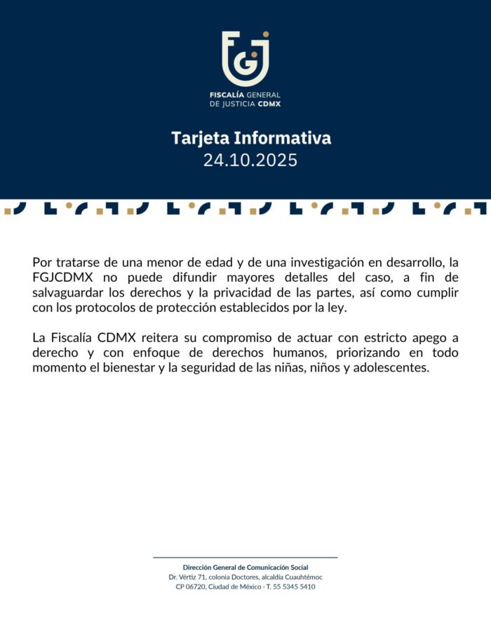 La Fiscalía apuntó en un comunicado que la menor “actualmente permanece bajo resguardo institucional, en condiciones seguras y con acompañamiento integral, conforme al principio del interés superior de la niñez, derivado de una investigación en curso por violencia familiar”.