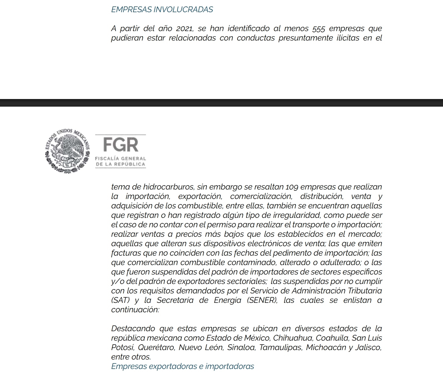 A partir del año 2021, se han identificado al menos 555 empresas que pudieran estar relacionadas con conductas presuntamente ilícitas en el tema de hidrocarburos, sin embargo se resaltan 109 empresas que realizan la importación, exportación, comercialización, distribución, venta y adquisición de los combustible, entre ellas, también se encuentran aquellas que registran o han registrado algún tipo de irregularidad, como puede ser el caso de no contar con el permiso para realizar el transporte o importación; realizar ventas a precios más bajos que los establecidos en el mercado; aquellas que alteran sus dispositivos electrónicos de venta; las que emiten facturas que no coinciden con las fechas del pedimento de importación; las que comercializan combustible contaminado, alterado o adulterado; o las que fueron suspendidas del padrón de importadores de sectores específicos y/o del padrón de exportadores sectoriales; las suspendidas por no cumplir con los requisitos demandados por el Servicio de Administración Tributaria (SAT) y la Secretaría de Energía (SENER), las cuales se enlistan a continuación”.