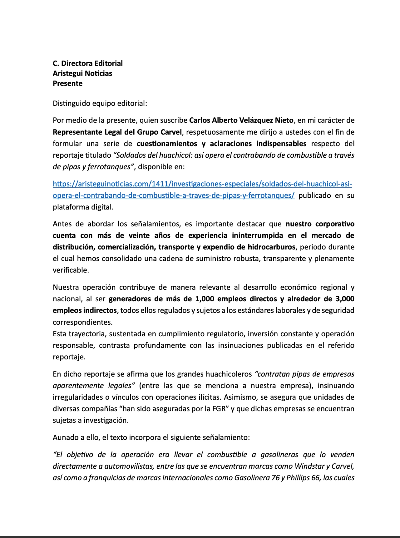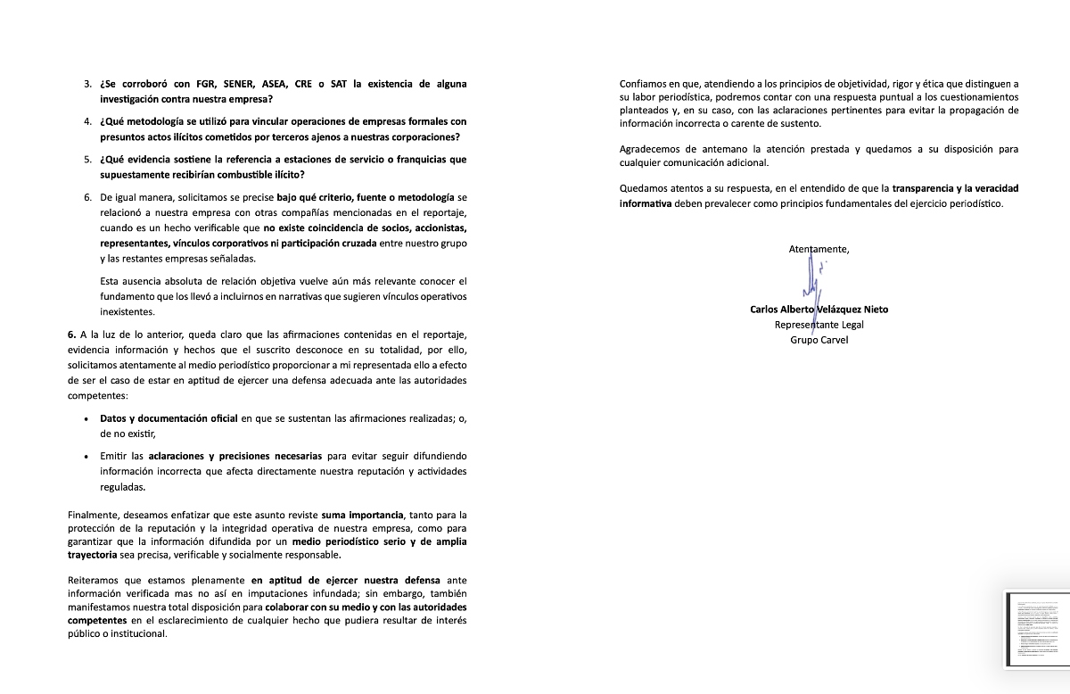 La segunda réplica fue enviada por Grupo Carvel, representado legalmente por Carlos Alberto Velázquez Nieto. Carvel afirmó que cuenta con una trayectoria de más de dos décadas en el sector de hidrocarburos y que ha generado miles de empleos. Calificó como insostenible la referencia del reportaje a empresas “aparentemente legales” e insistió en que no existe registro alguno —federal o estatal— que los investigue o implique.