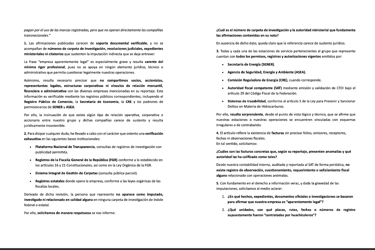 Solicita conocer números de carpeta, documentos, facturas o expedientes que sustenten las afirmaciones del reportaje, y cuestiona la metodología utilizada para relacionar a la empresa con operaciones ilícitas o con otras compañías que —asegura— no guardan vínculo corporativo ni operativo con su grupo. Señala que todas sus estaciones de servicio cuentan con permisos vigentes ante SENER, ASEA, CRE y SAT, y pide aclaraciones que eviten la propagación de información incorrecta.