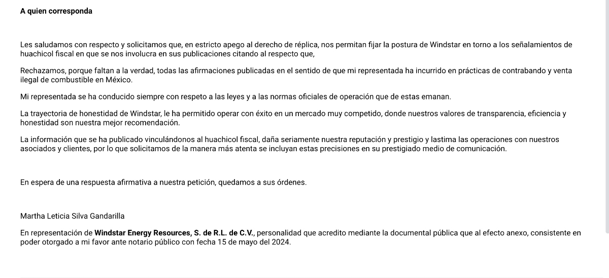 Windstar Energy Resources, S. de R.L. de C.V., a través de su representante Martha Leticia Silva Gandarilla, rechaza categóricamente cualquier afirmación que la vincule con prácticas de contrabando o venta ilegal de combustible. La empresa sostiene que ha operado siempre con apego a la ley y a las normas oficiales, y que su trayectoria se fundamenta en valores de transparencia, eficiencia y honestidad. Afirma que la información que la relaciona con el huachicol fiscal es falsa, afecta su reputación y lastima sus operaciones con clientes y asociados, por lo que solicita que se integren estas precisiones en nuestro medio.