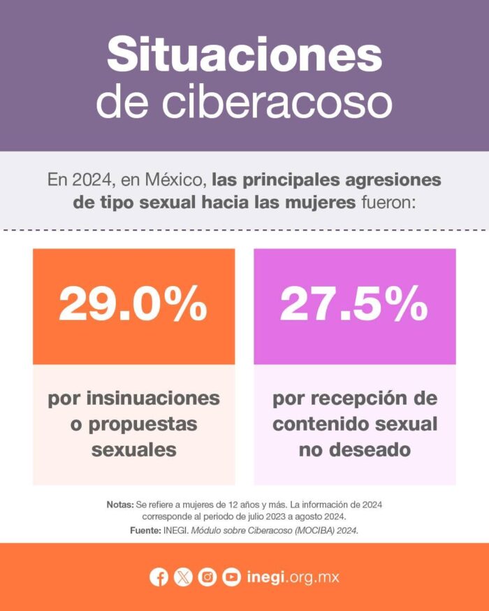 A propósito del Día Internacional de la Eliminación de la Violencia contra la Mujer, el Inegi dio a conocer cifras del Módulo sobre Ciberacoso (MOCIBA) 2024, que revelan que las mujeres en México enfrentan mayores niveles de violencia digital, especialmente en actos de índole sexual y en agresiones cometidas por desconocidos.