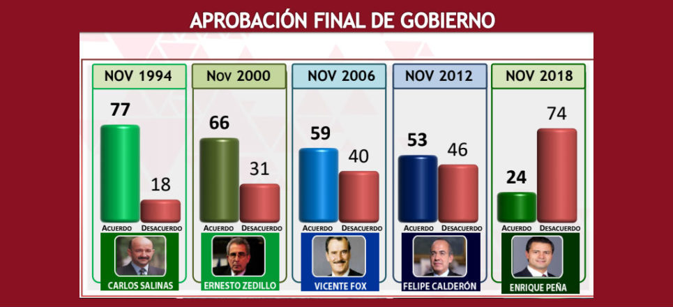 Esto representa el cierre más bajo para un presidente, pues desde Carlos Salinas hasta Felipe Calderón su aprobación superó el 50 por ciento.