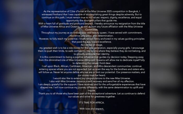 “Como representante de Costa de Marfil en el concurso Miss Universo 2025, en Bangkok, fui testigo directo de mi capacidad para lograr grandes cosas a pesar de la adversidad”, señaló Yacé al inicio de su texto.