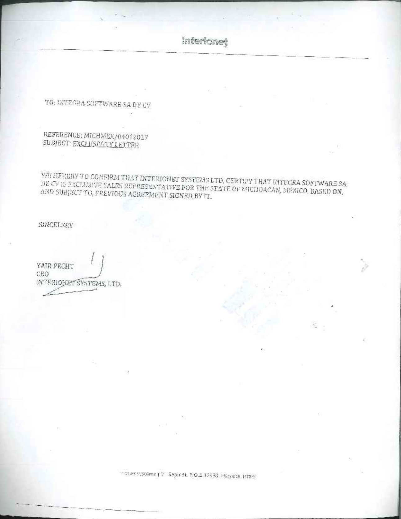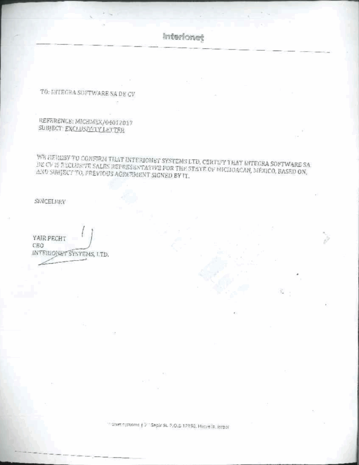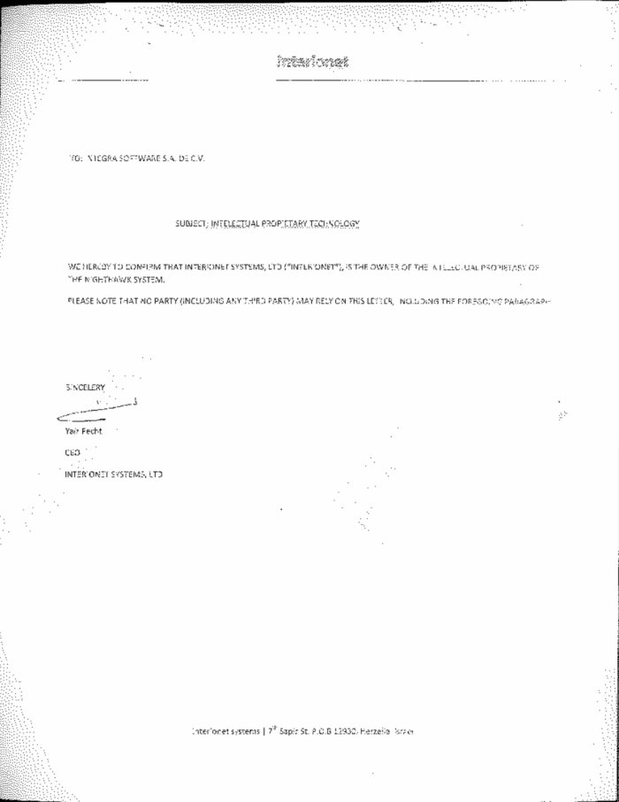 Entre los documentos obtenidos por MCCI se encuentra, como parte de los anexos del contrato, la carta de exclusividad con la que Interionet Systems LTD certificó a Integra Software SA de CV como su representante de ventas ante el gobierno de Michoacán. En un segundo oficio, también dirigido a Integra Software, la empresa israelí se ostentó como la dueña de la propiedad intelectual del sistema NightHawk.