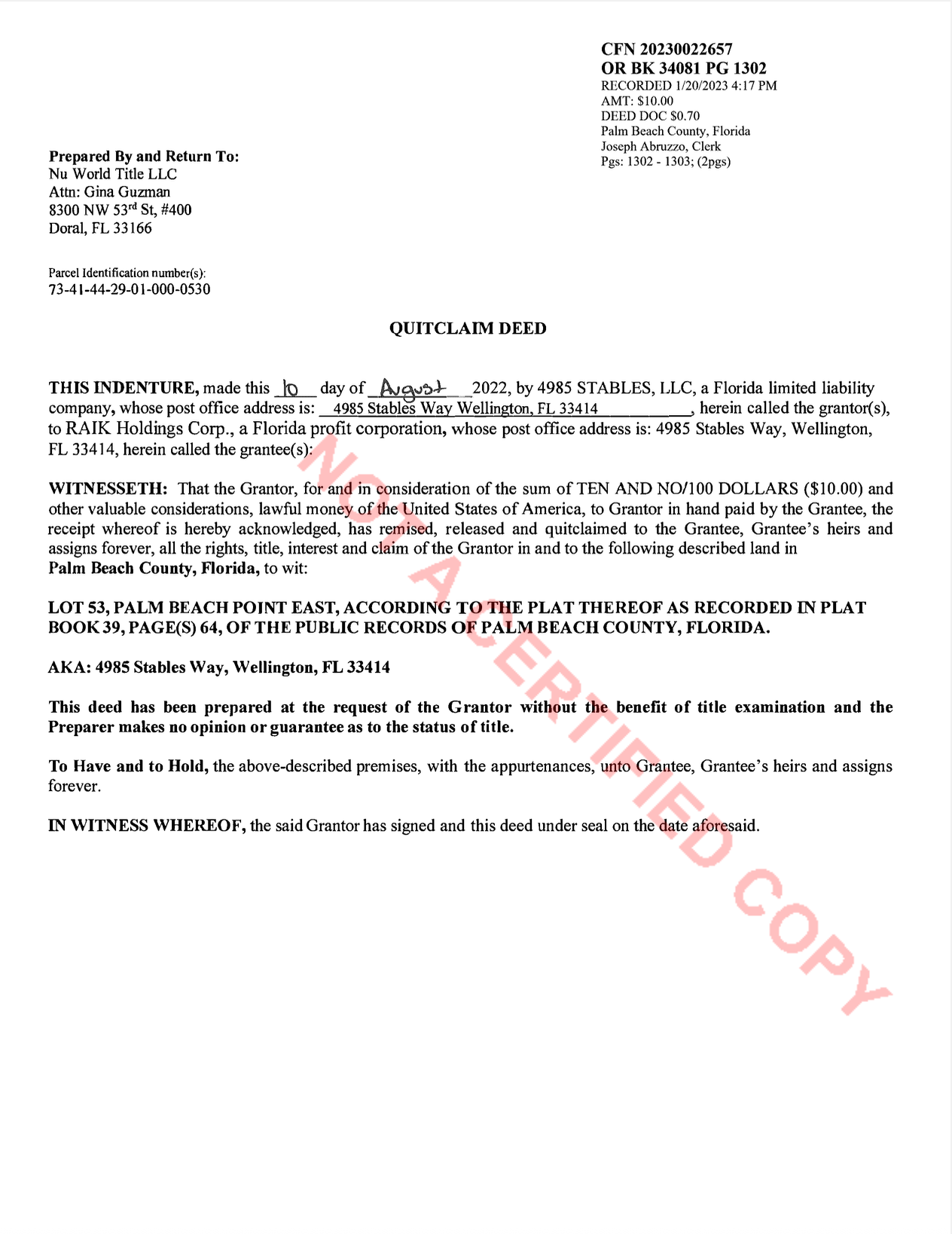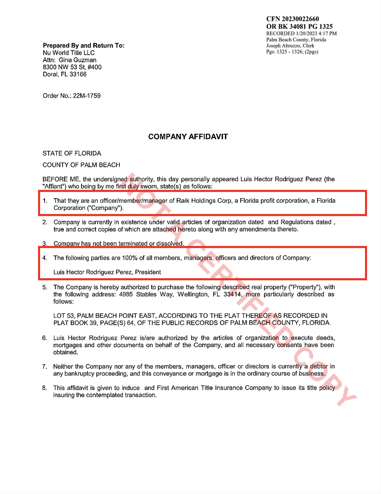 Ahora, registros del condado de Palm Beach consultados por Mexicanos Contra la Corrupción y la Impunidad (MCCI) revelan que, en agosto de 2022, la empresa 4985 Stables LLC –empleada por Álvarez Puga para adquirir la ostentosa finca– cedió los derechos de la propiedad a Raik Holdings Corp., compañía administrada y presidida por Luis Héctor Rodríguez Pérez, quien se desempeñó en el gobierno de Aureoles como titular de la Dirección Jurídica de la Secretaría de Finanzas y Administración.