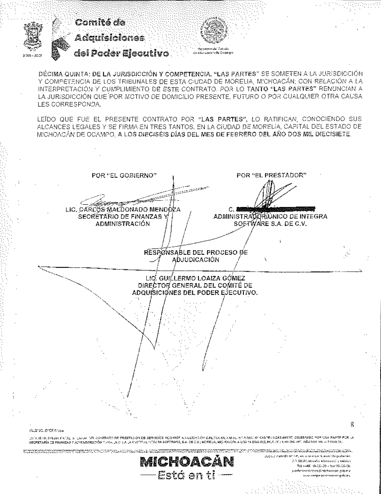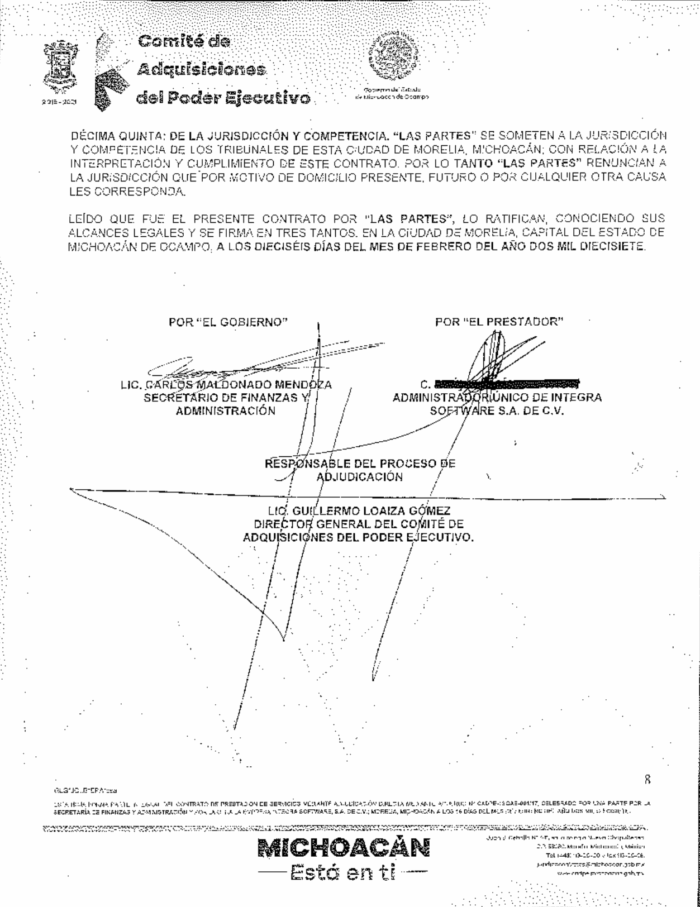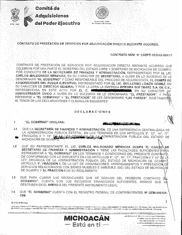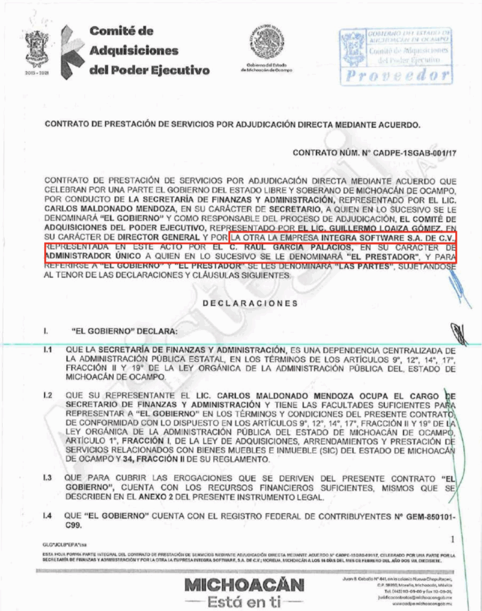 El contrato, del que MCCI obtuvo una copia vía transparencia, fue otorgado por adjudicación directa en febrero de 2017 y fue suscrito precisamente por Carlos Maldonado Mendoza, entonces secretario de Finanzas, y por Raúl García Palacios como administrador único de Integra Software SA de CV.