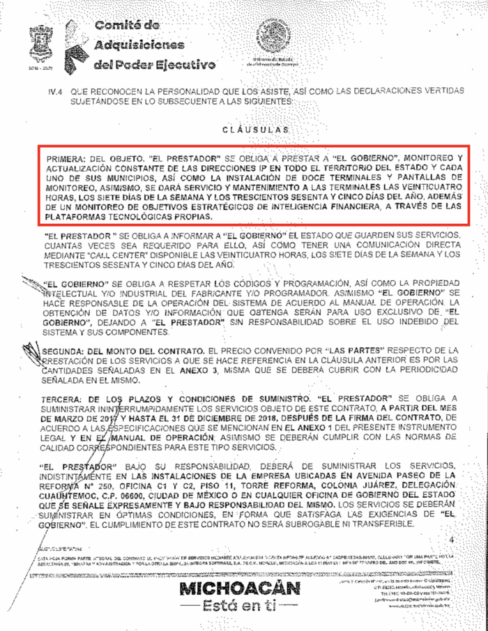 Integra Software SA de CV fue contratada por la Secretaría de Finanzas para llevar a cabo el monitoreo y actualización de las direcciones IP en todo el territorio del estado, mediante la instalación de doce terminales y pantallas de vigilancia que operarían los 365 días del año. El gobierno del ahora prófugo Silvano Aureoles justificó la contratación argumentando que el sistema permitiría dar seguimiento a “objetivos estratégicos de inteligencia financiera” a través de una tecnología que describió como “única en el mundo”.