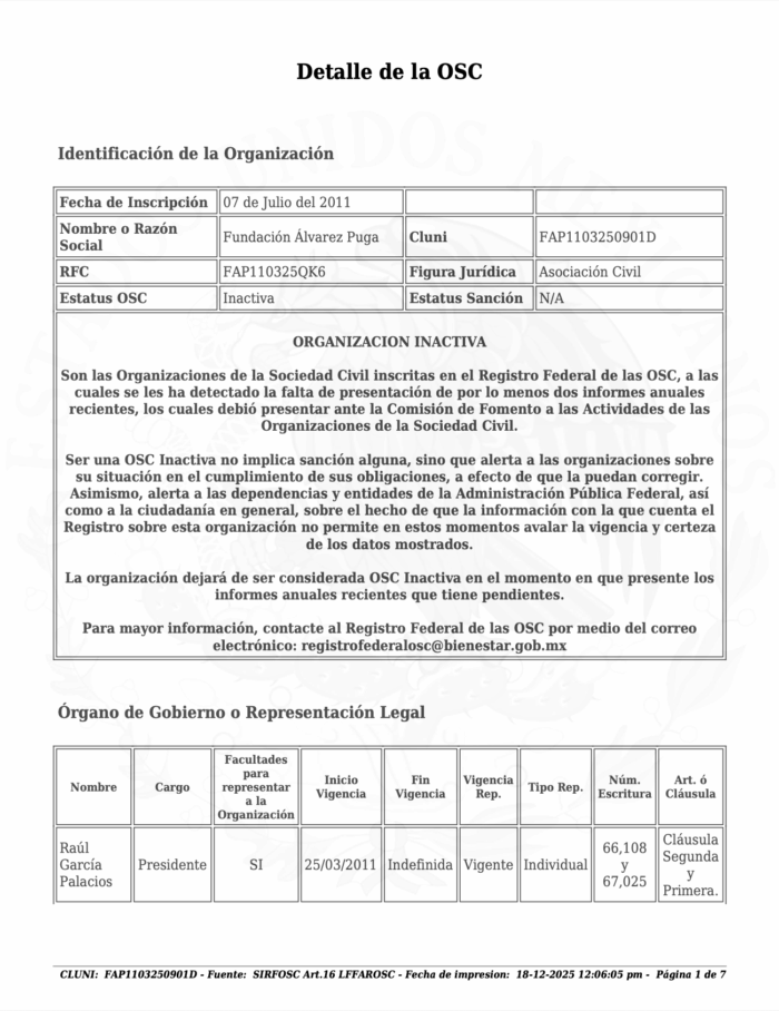Por ejemplo, García Palacios fungió como presidente de la Fundación Álvarez Puga, creada en 2011 para apoyar a sectores desprotegidos con alimentos, vestido y asesoría legal. En ella, formaba parte del órgano de gobierno junto con Sebastián Felipe Rodríguez Robles, un viejo socio de Álvarez Puga que fue tesorero del gobierno de Manuel Velasco en Chiapas.