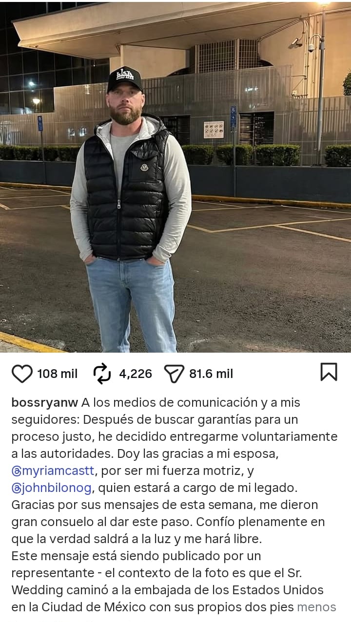 “Este mensaje está siendo publicado por un representante – el contexto de la foto es que el Sr. Wedding caminó a la embajada de los Estados Unidos en la Ciudad de México con sus propios pies”, concluye el texto que acompaña a la foto de Wedding en una cuenta recién creada (@bossryanw).