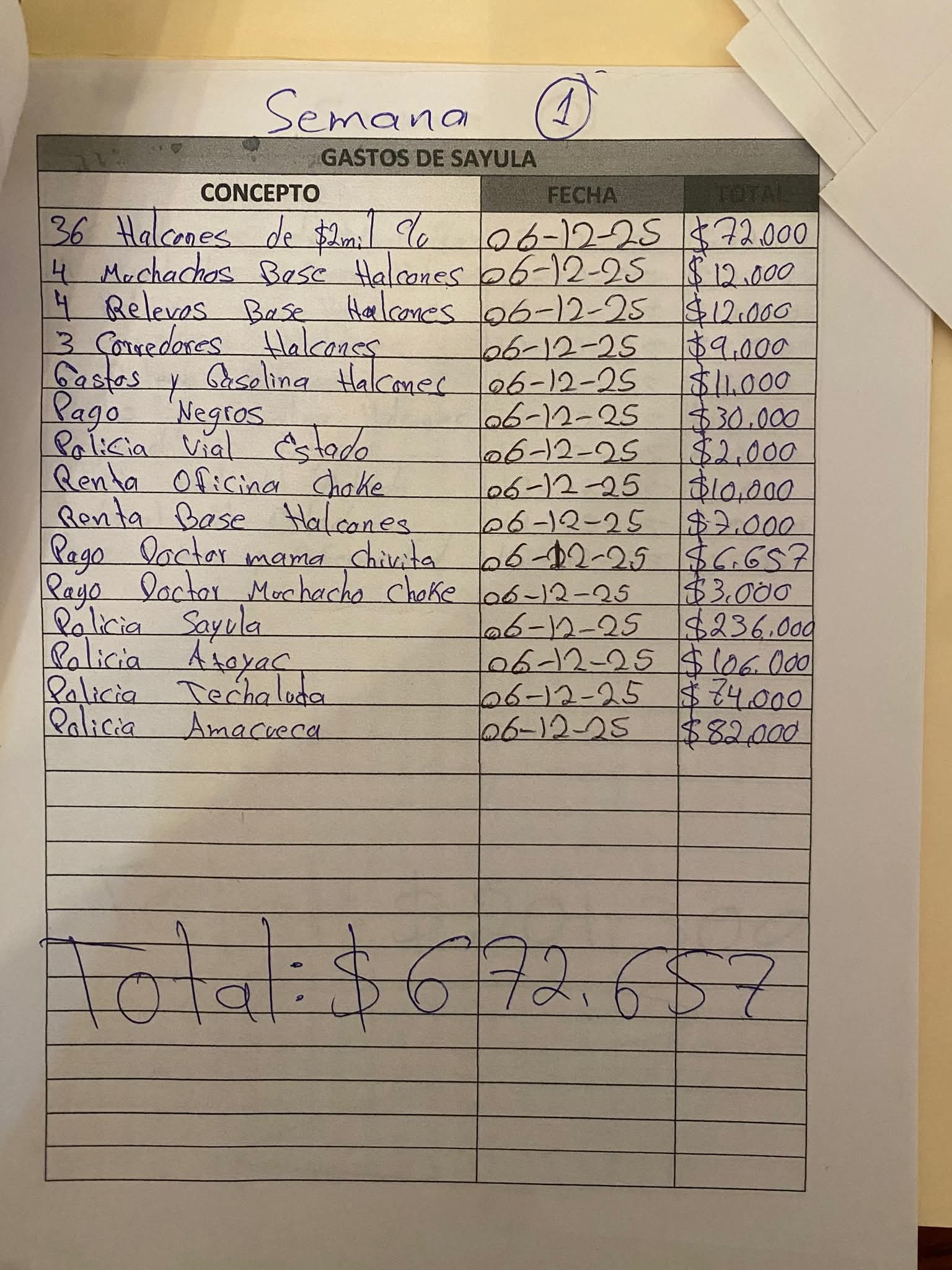 Resalta en los gatos que en el apartado “Gastos de Sayula”, fechado el 6 de diciembre de 2025, se consigna el pago a 36 halcones de 2 mil pesos cada uno, lo que suma 72 mil pesos en una sola semana; esas son personas que vigilan a las autoridades para anticipar a los grupos criminales.