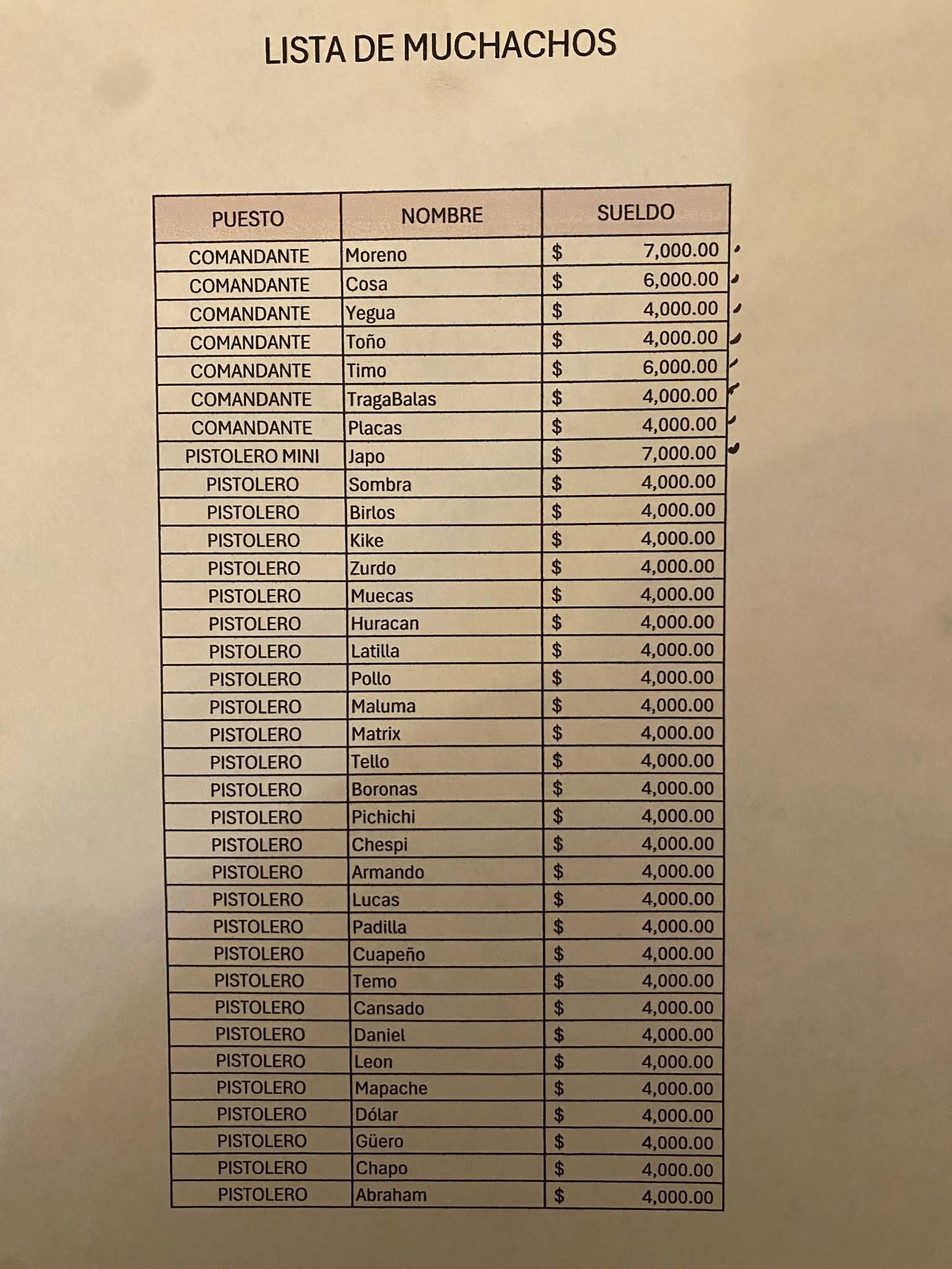 En el listado hallado figuran más de 30 pistoleros con sueldo de 4 mil pesos semanales, pero no revela si pertenecen a una sola célula o alguna región en particular.